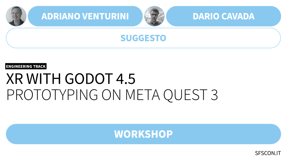 Oltre al workshop, Suggesto sarà presente nello XR Hacking Village, uno spazio tematico di SFSCON dedicato alle potenzialità delle tecnologie immersive basate su soluzioni open-source.